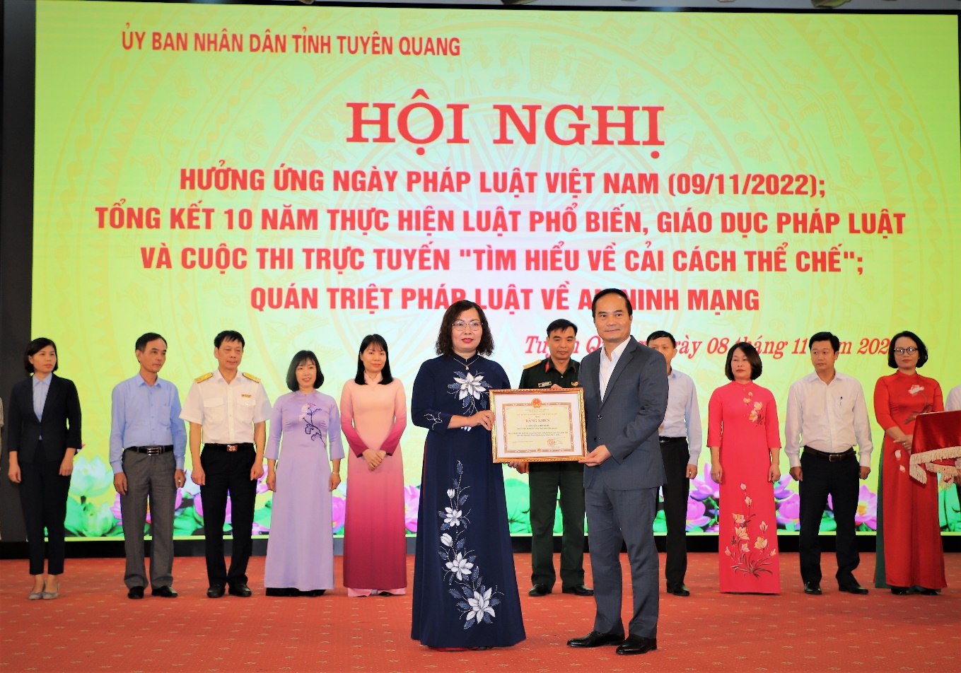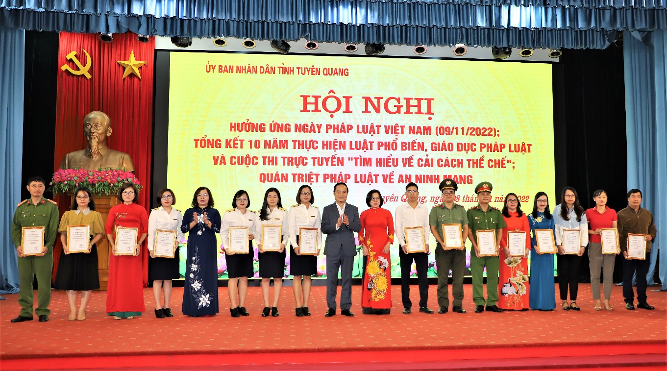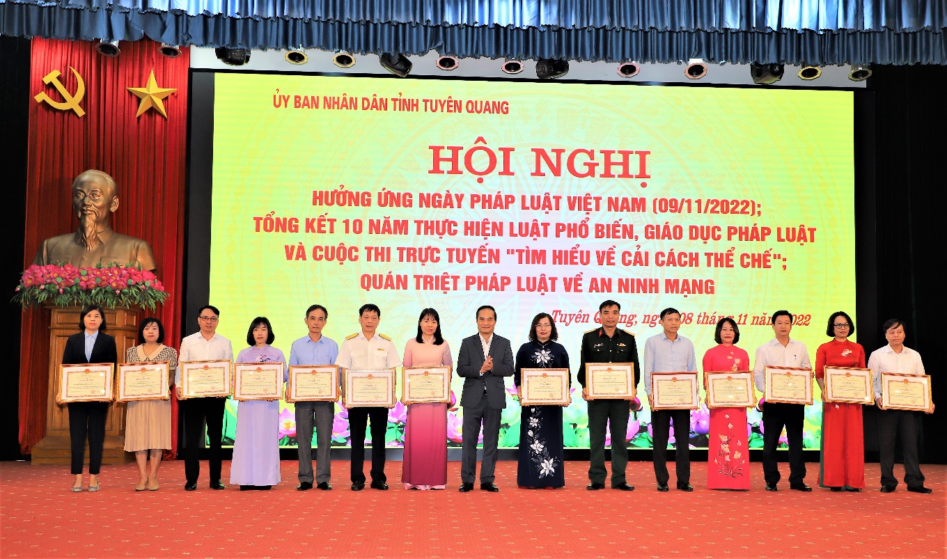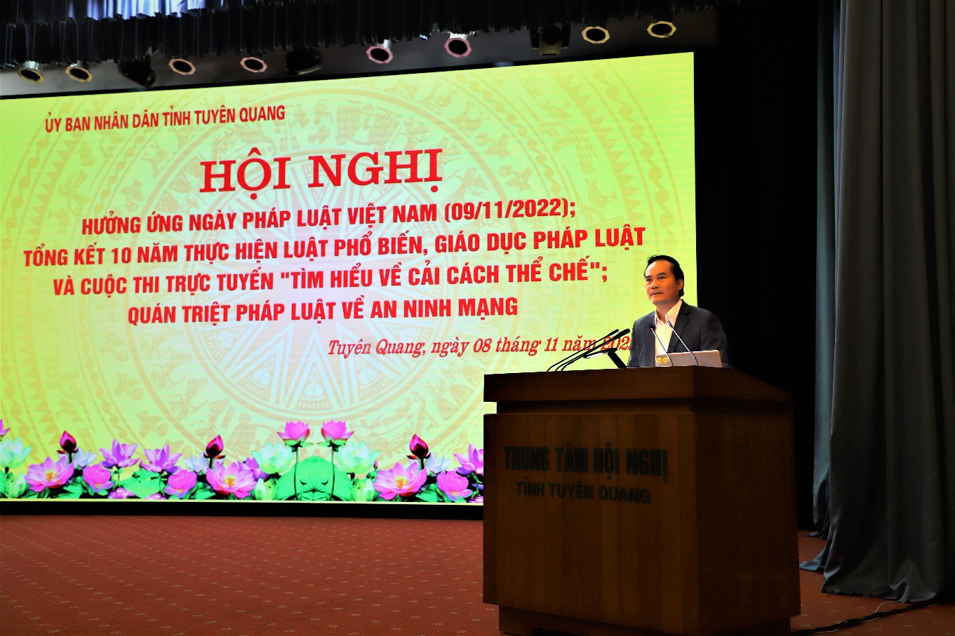 Ngày 08/11/2022, tại Trung tâm Hội nghị tỉnh, Ủy ban nhân dân tỉnh Tuyên Quang tổ chức Hội nghị hưởng ứng Ngày Pháp luật nước Cộng hòa xã hội chủ nghĩa Việt Nam; tổng kết 10 năm thực hiện Luật Phổ biến, giáo dục pháp luật và tổng kết Cuộc thi trực tuyến “Tìm hiểu về cải cách thể chế”; quán triệt pháp luật về an ninh mạng. Đồng chí Hoàng Việt Phương, Ủy viên Ban Chấp hành Đảng bộ tỉnh, Phó Chủ tịch UBND tỉnh, Chủ tịch Hội đồng phối hợp phổ biến, giáo dục pháp luật tỉnh chủ trì Hội nghị.