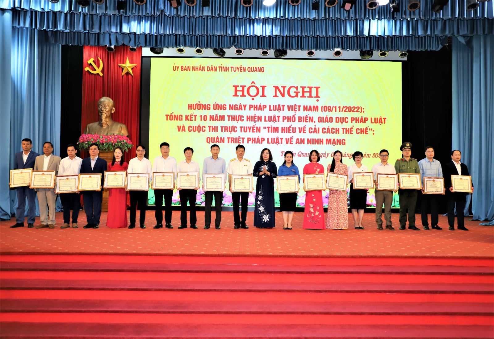 Và để ghi nhận thành tích các tập thể, cá nhân, tại Hội nghị đã công bố và trao Bằng khen của Chủ tịch UBND tỉnh cho 18 tập thể, 19 cá nhân có thành tích xuấtt sắc trong 10 năm thực hiện Luật PBGDPL.