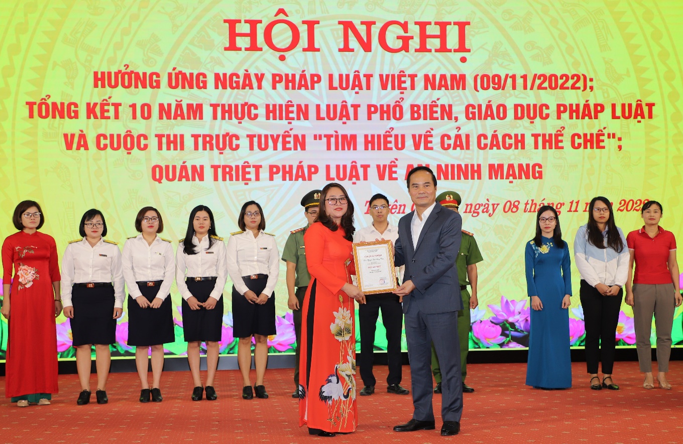 Một trong những hình thức PBGDPL phát huy hiệu quả cao đó là tổ chức các cuộc thi, hội thi tìm hiểu pháp luật. Để thiết thực hưởng ứng Ngày Pháp luật nước Cộng hoà xã hội chủ nghĩa Việt Nam năm 2022, tuyên truyền, phổ biến các quy định về cải cách thể chế, Uỷ ban nhân dân tỉnh đã tổ chức thành công Cuộc thi trực tuyến “Tìm hiểu về cải cách thể chế”, thu hút 12.945 lượt người đăng ký tham gia dự thi với 18.350 lượt thi. Tại Hội nghị, Ban Tổ chức Cuộc thi đã trao Giấy chứng nhận cho 19 thí sinh đạt giải vòng chung khảo.