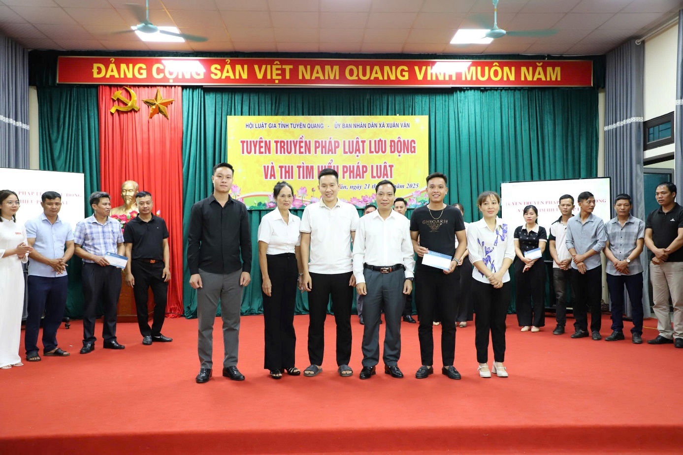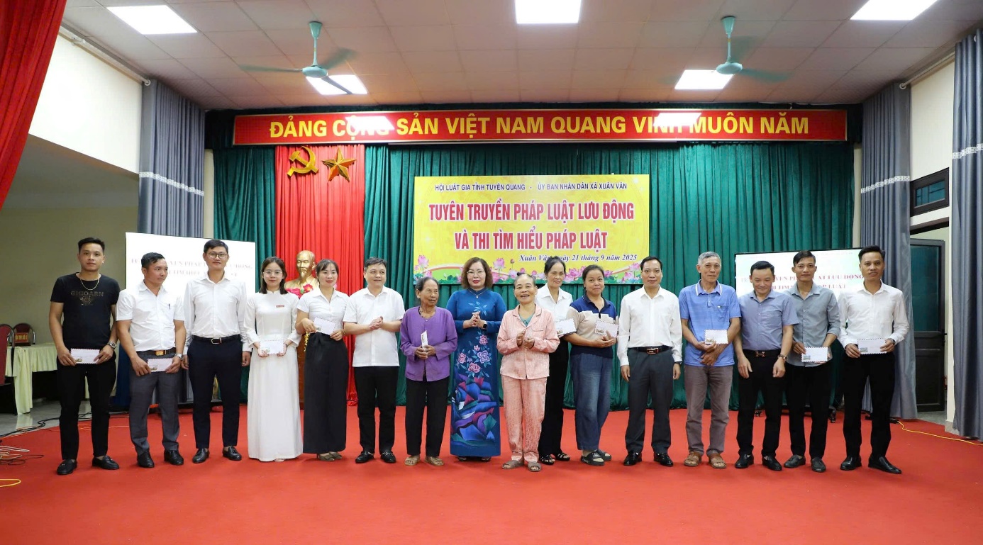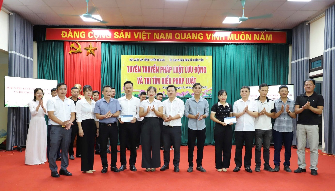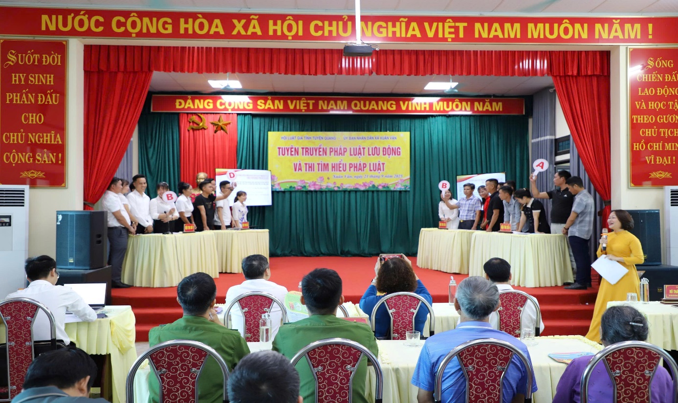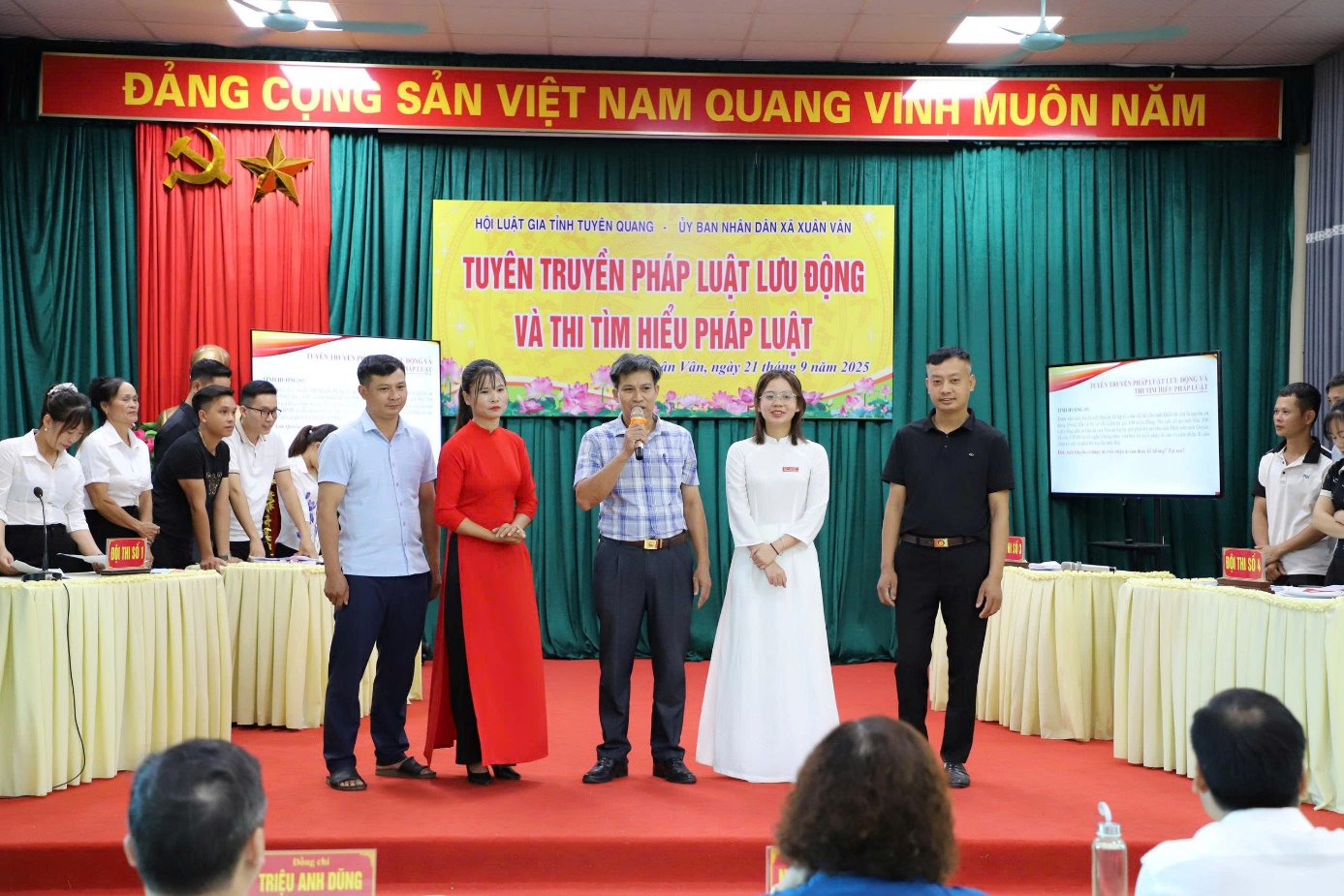 Thực hiện Kế hoạch số 27/KH-UBND ngày 08/8/2025 của Uỷ ban nhân dân tỉnh Phát động phong trào thi đua yêu nước lập thành tích xuất sắc chào mừng Đại hội đại biểu Đảng bộ tỉnh Tuyên Quang, nhiệm kỳ 2025-2030 và Đại hội đại biểu lần thứ XIV của Đảng, ngày 21/9/2025, Hội Luật gia tỉnh Tuyên Quang đã phối hợp với Uỷ ban nhân dân xã Xuân Vân tổ chức Tuyên truyền pháp luật lưu động và Hội thi tìm hiểu pháp luật. Luật gia Nguyễn Thị Thược, Chủ tịch Hội Luật gia tỉnh cùng Phó Bí thư Thường trực Đảng uỷ xã Triệu Anh Dũng và Phó Bí thư Đảng uỷ, Chủ tịch Uỷ ban nhân dân xã Xuân Vân Hà Mạnh Linh dự và chỉ đạo. Tham dự, cổ vũ Hội thi có trên 100 đại biểu là cán bộ, công chức xã và người dân xã Xuân Vân.