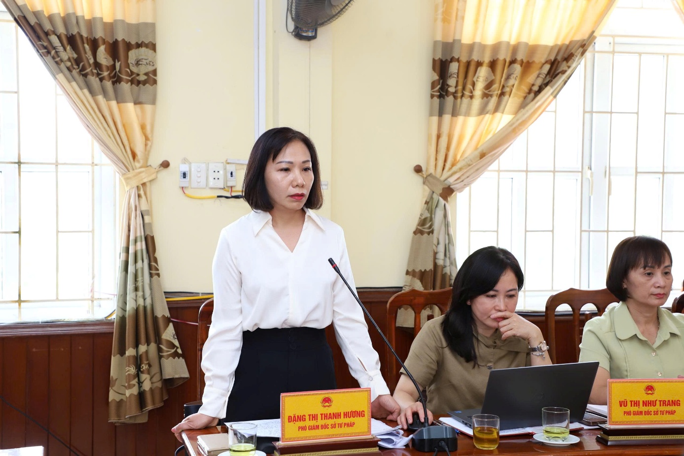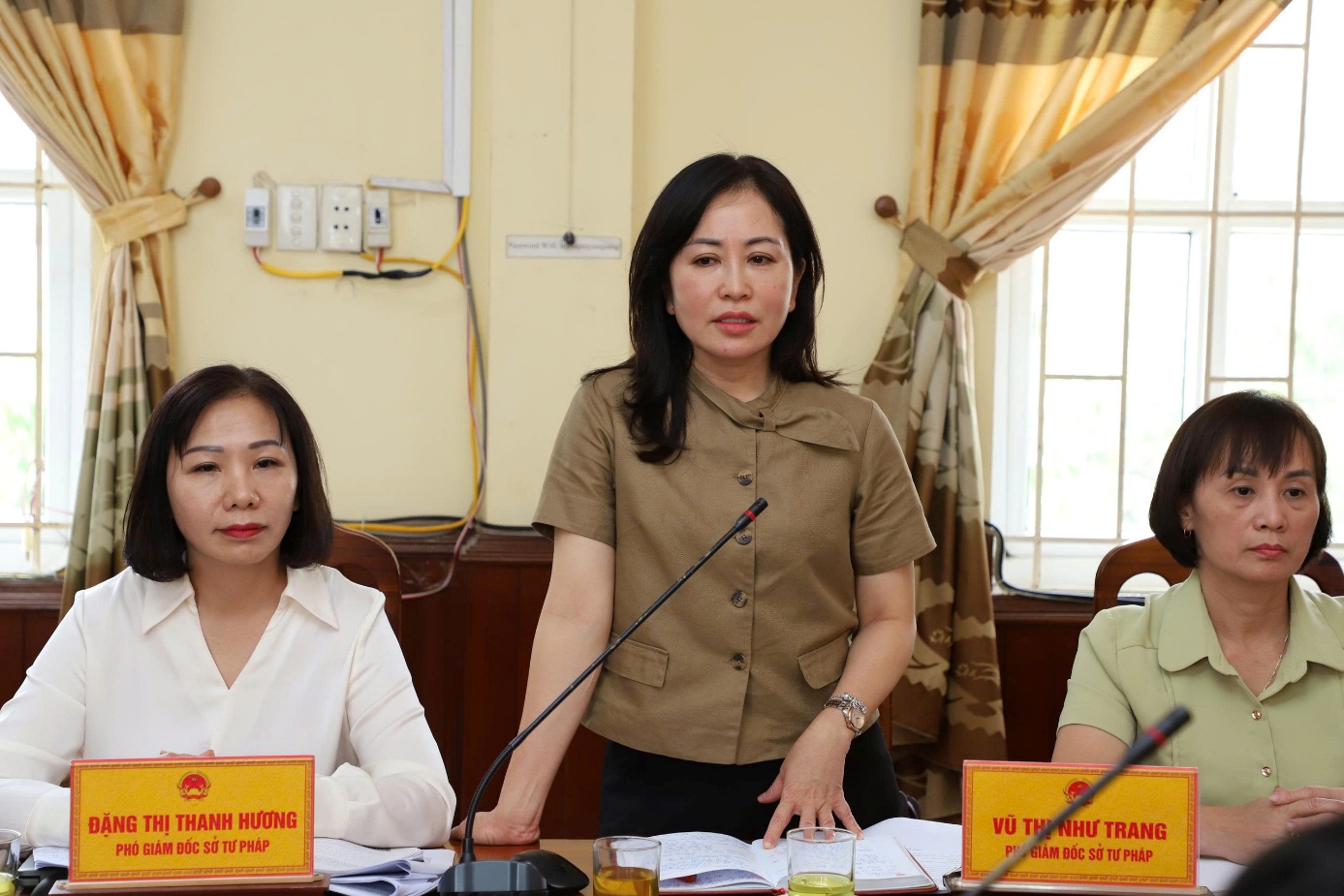 Đồng chí Vũ Thị Như Trang, Phó Giám đốc Sở Tư pháp phát biểu tại Hội nghị