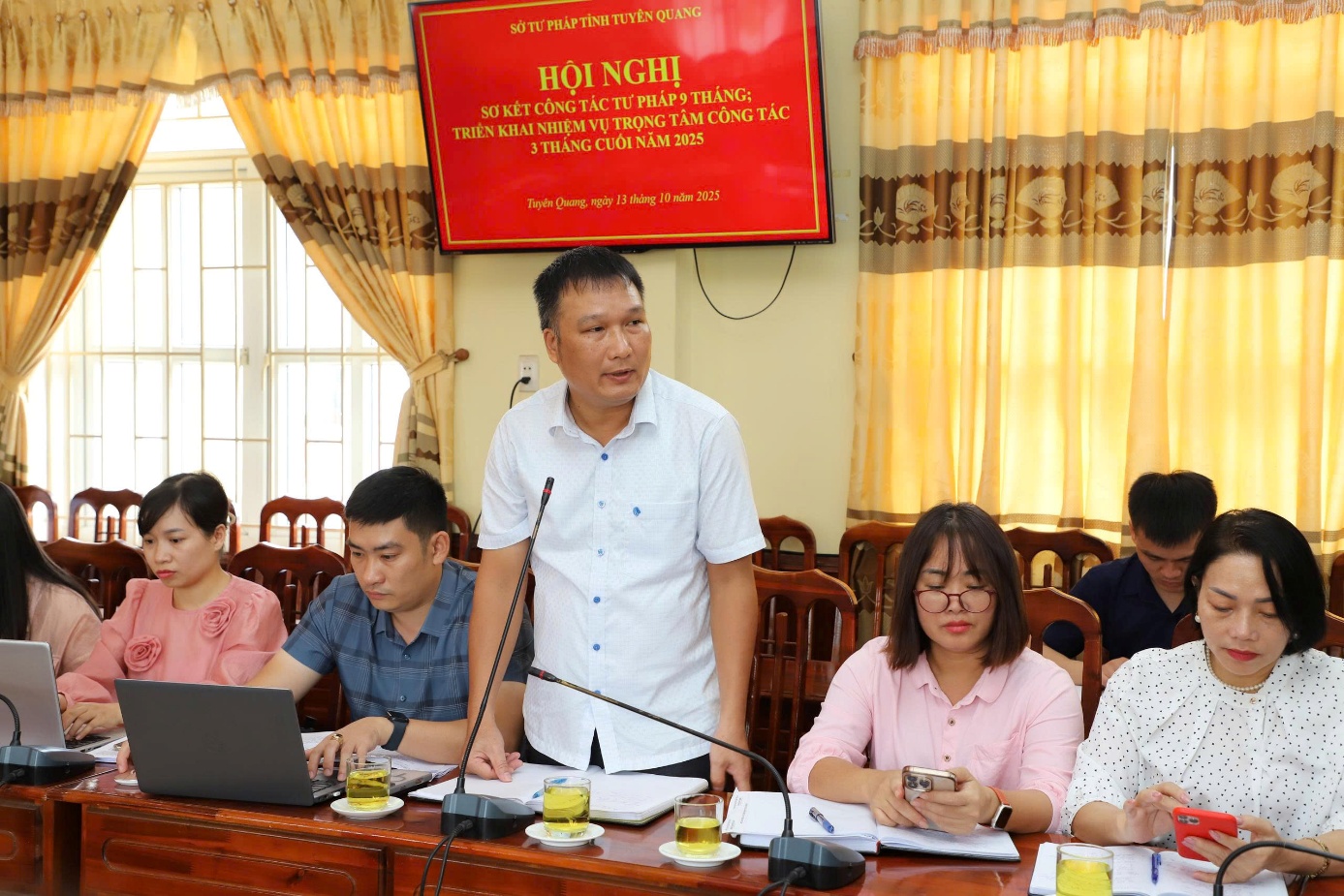 Tại Hội nghị đã có 12 ý kiến thảo luận, trong đó tập trung đánh giá tình hình, kết quả triển khai thực hiện công tác tư pháp, cải cách hành chính, chuyển đổi số của Sở/Ngành Tư pháp trong 9 tháng năm 2025; những tồn tại, hạn chế, khó khăn, vướng mắc và nguyên nhân, đề xuất, kiến nghị các giải pháp cụ thể nhằm khắc phục những hạn chế và tháo gỡ khó khăn, vướng mắc trong công tác tư pháp, như: Việc thực hiện một số ít nhiệm vụ có việc còn chậm, chất lượng có việc kết quả chưa cao do trong 9 tháng đầu năm, có lúc phát sinh nhiều nhiệm vụ phải thực hiện trong cùng một thời điểm, đặc biệt là một số nhiệm vụ phát sinh trong thời gian đầu hợp nhất Sở Tư pháp cần ưu tiên tập trung giải quyết; việc chấp hành chế độ báo cáo trong lĩnh vực xử lý vi phạm hành chính của một số đơn vị chưa kịp thời; công chức tư pháp cấp xã có nơi còn lúng túng trong xử lý, giải quyết TTHC trên các Hệ thống phần mềm (phiên bản mới); việc triển khai đồng thời 02 Cơ sở dữ liệu khác nhau về công chứng, chứng thực dẫn việc khai thác, cập nhật còn khó khăn; kết quả đánh giá chỉ số chỉ đạo, điều hành và đánh giá chất lượng phục vụ người dân, doanh nghiệp trong thực hiện thủ tục hành chính, dịch vụ công theo thời gian thực trên môi trường điện tử có thời điểm còn chưa cao do một số Quyết định công bố TTHC chưa được gửi kịp thời cho Sở Tư pháp, việc đồng bộ thông tin giữa Hệ thống thông tin giải quyết TTHC tỉnh và Cổng DVC quốc gia có thời điểm chưa được thống nhất.